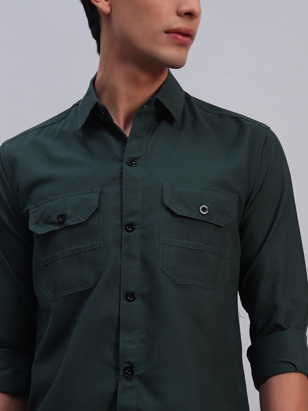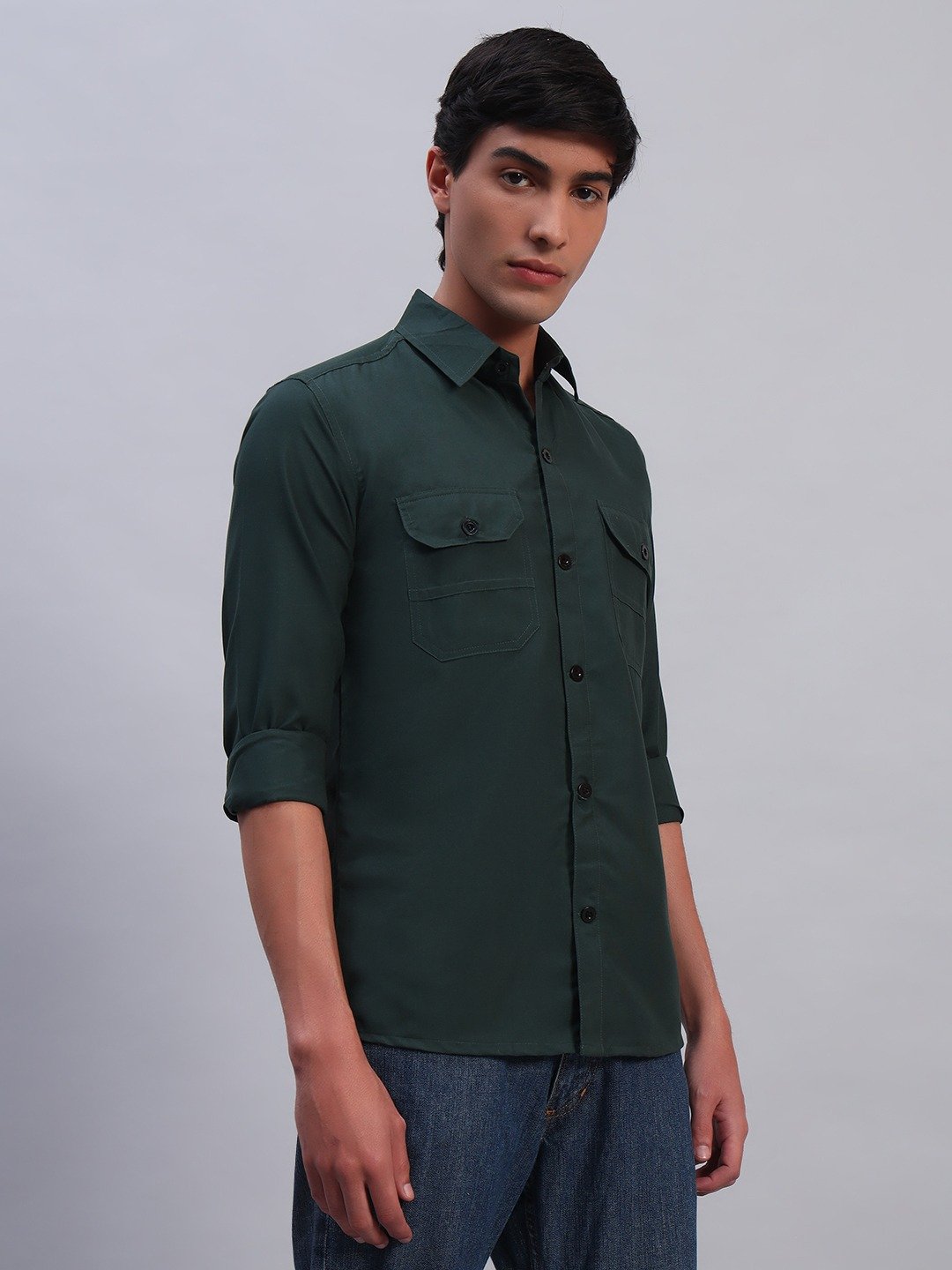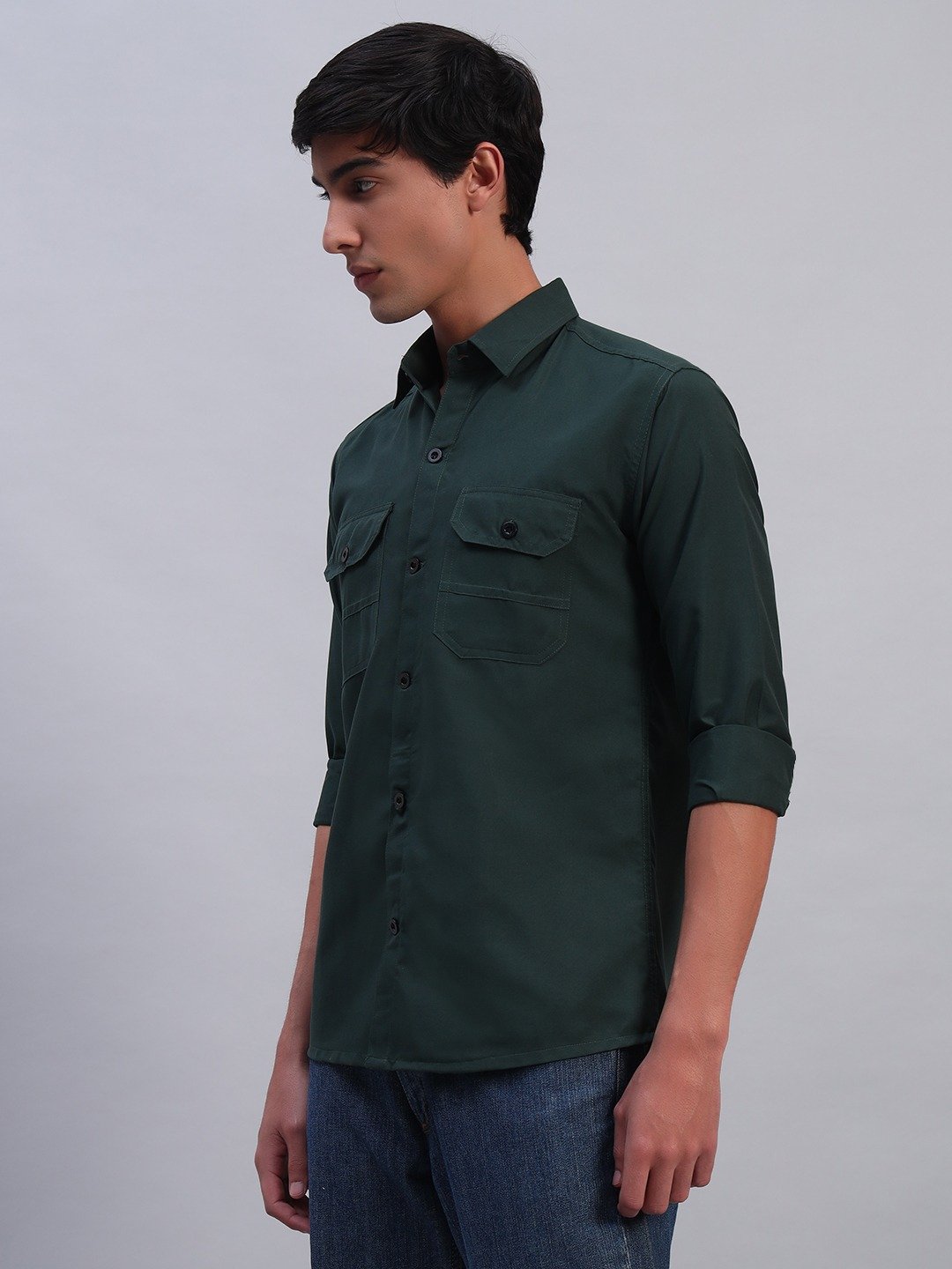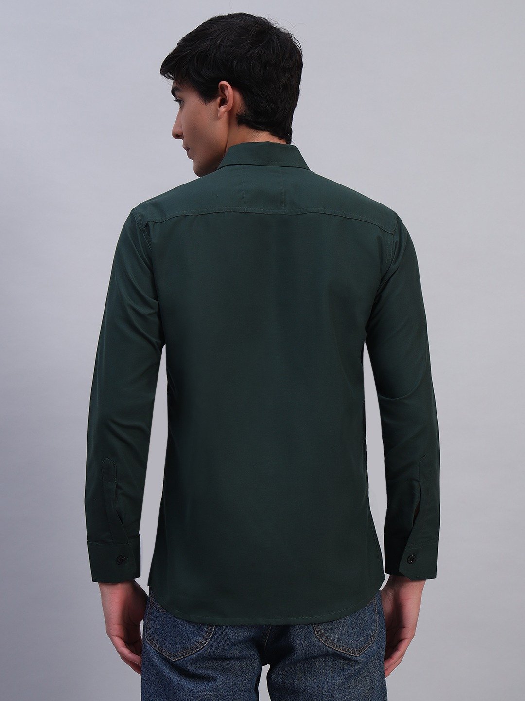 Elevate your casual wardrobe with this solid dark green slim fit shirt for men. Crafted from a soft and breathable cotton blend, this shirt features twin chest flap pockets, full button-down front, and roll-up sleeves — making it perfect for both casual hangouts and smart-casual office looks. The rich dark green color adds a bold yet versatile touch to your outfit.