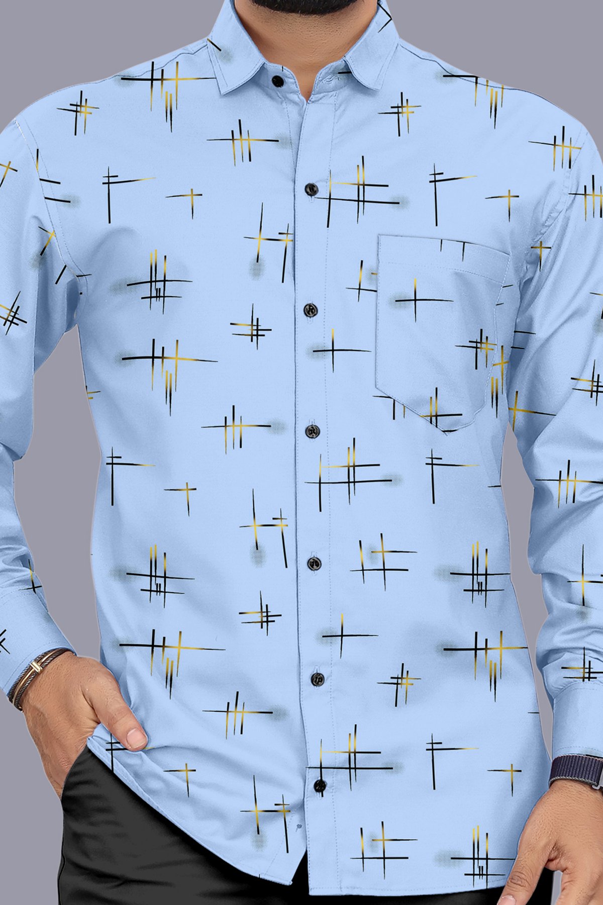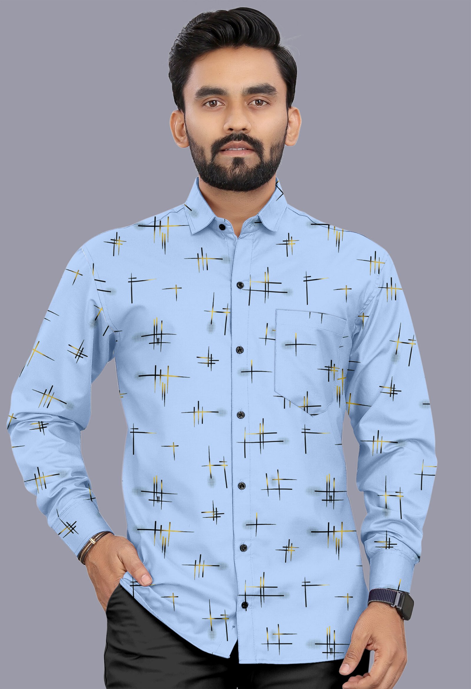 Fresh sky blue casual shirt with stylish printed design. Ideal for office, casual outings, and daily wear.