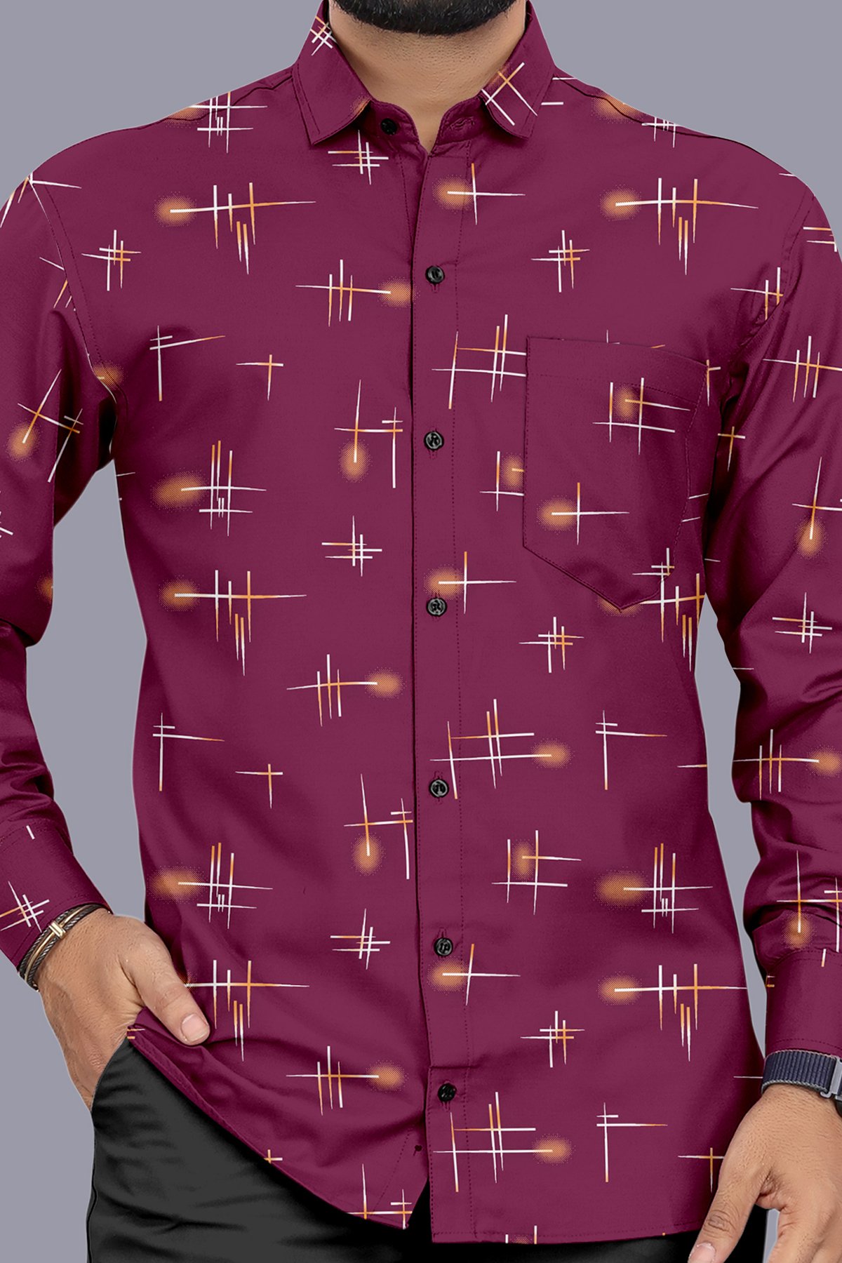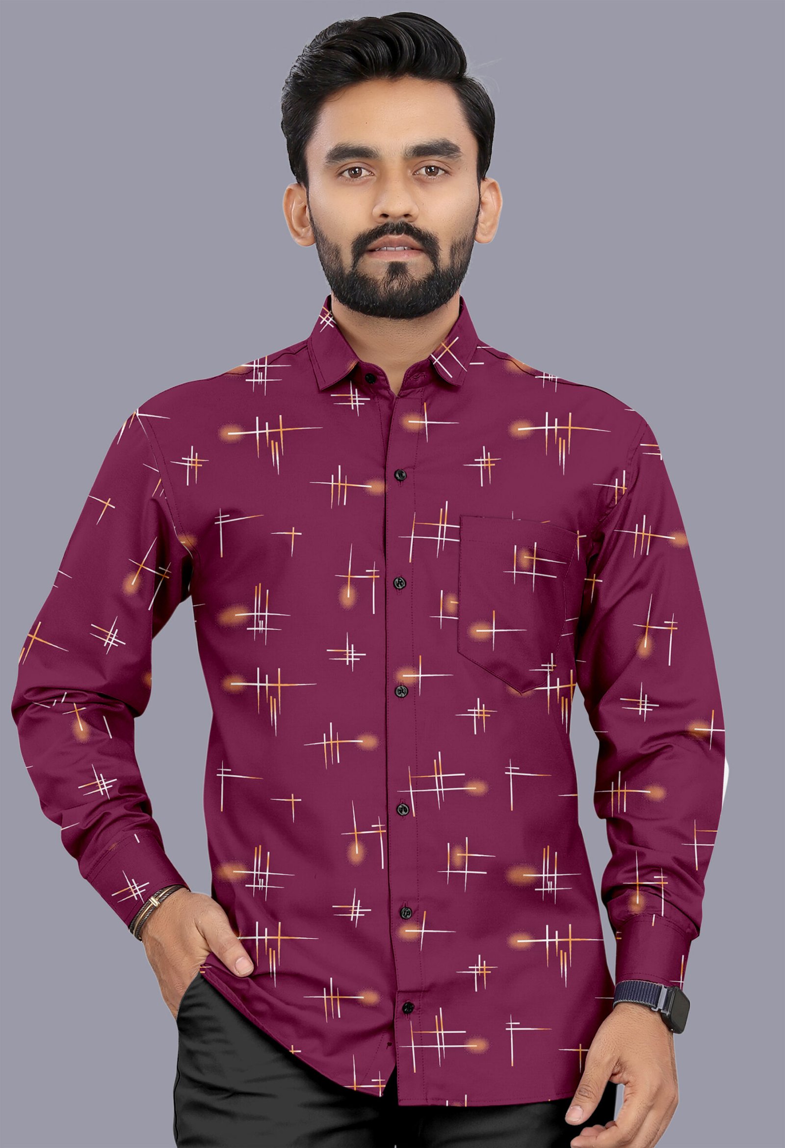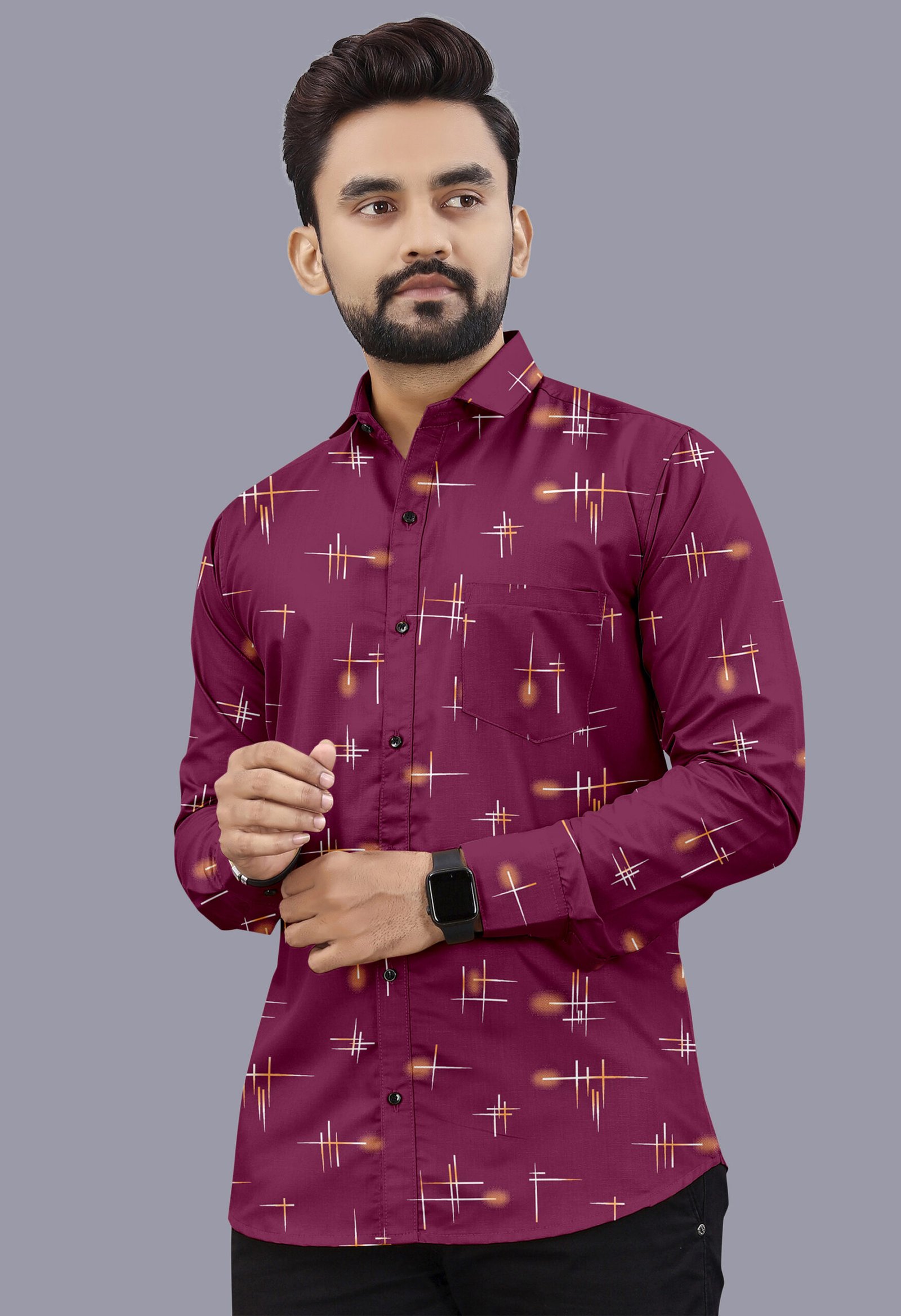 Stand out with timeless style in this elegant Wine Red Printed Casual Shirt for Men.